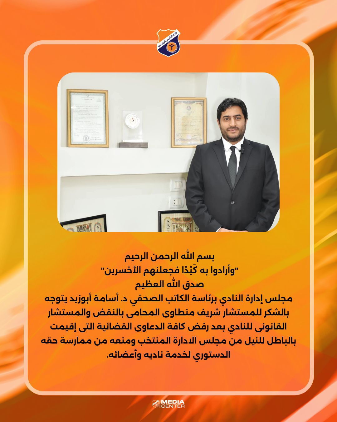 تقدم مجلس إدارة نادى الشمس برئاسة الكاتب الصحفى د. أسامة أبو زيد بالشكر إلى المستشار شريف منطاوى المحامى بالنقض والمستشار القانونى بالنادى على انجازاته فى القطاع القانونى فى النادى خلال الفترة السابقة.